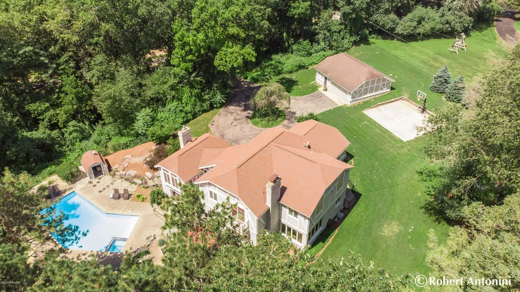 Enjoy $140,000 in recent updates inside and out! Privacy abounds on this rare offering of almost 3 acres in Forest Hills Schools. Nearly 4,100 sq ft finished, 5-bedroom, 3.5 bath Tudor surrounded by the sights and sounds of nature. Nestled below the tiered waterfall, a saltwater pool and hot tub are accessed by either the upper stone patio or walkout basement. The totally updated kitchen offers a large center island with snack bar and prep sink, an abundance of beautiful white cabinetry with under-cabinet lighting and plenty of functional counterspace. The eating area overlooks the private natural setting. You'll enjoy all new flooring through the main floor and new windows throughout the home on all levels. Just off the foyer you'll find the formal dining room which is open to the family