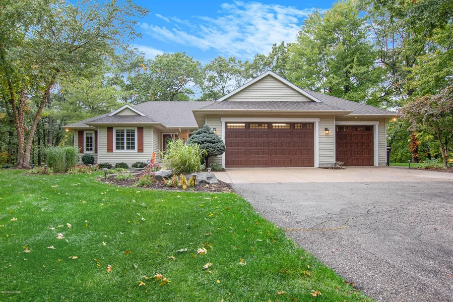 Meticulous Ranch in the highly desirable Northview School System. This home sits on just under 2 wooded acres w/4 bedrooms & 4 baths. Master Suite w/Jacuzzi, living room with vaulted ceilings & fireplace. Formal dining w/Asian walnut flooring & sliders to deck which over looks your large wooded lot. Hardwired speaker system, updated kitchen w/double ovens & stainless GE profile appliances, countertop eating large enough for 4 barstools. Main floor laundry. The LL offers a large family, deluxe bar w/dishwasher, ice-maker, fridge, custom wine rack, and sliders to patio, great for entertaining. 2 more bedrooms & full bath. There's a back-up heating system with separate thermostat. 3 stall garage, sprinkler system and much more. Close to Dt GR, restaurants & shopping.