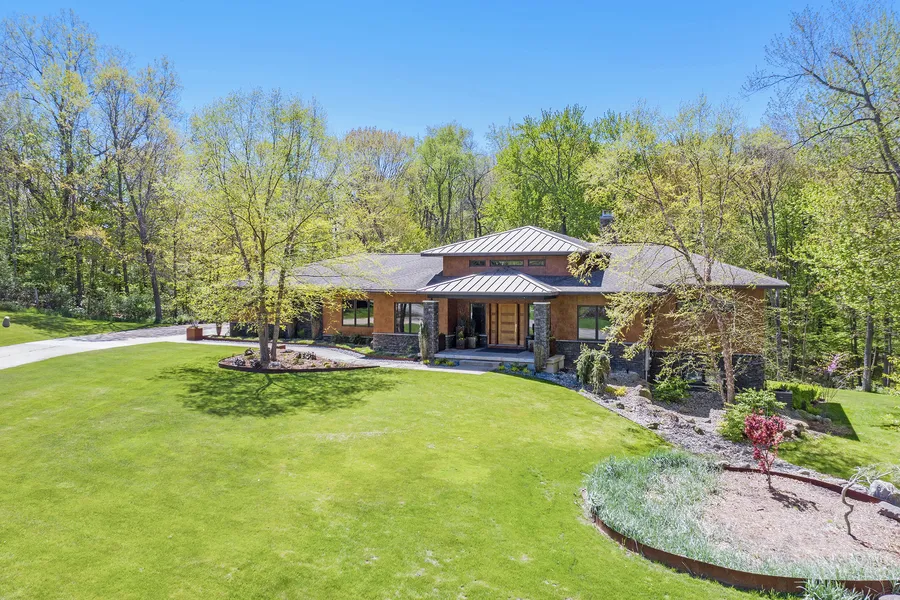 Rested on a 3.5 acre rolling hillside in the exclusive gated Skyevale Community of Ada, this extraordinary property will afford its new owner an unparalleled quality of life. Enter the secure gated community off from a natural beauty road and traverse the rolling private drive to this spectacular property that is poised to impress. Boasting more than 6,000 sf, and featuring a chefs kitchen with dueling work spaces, Sub Zero, Thermador and Bosch appliances, and built in wine fridge - simplifying the preparation for all of your gatherings. The open concept seamlessly flows into the dining and large living space where the high ceilings stand proud, making for the perfect entertaining space. This modern design is well appointed with the ability to outfit it to your preferences whether it be that existing modern flare or a more traditional design. Enjoy your master suite enclave with an attached nursery, office or den space, private covered deck, and spa like bathroom including a steam shower and luxurious soaking tub. The home fitness area will keep you in shape! Then you can splurge again from the lower level refreshment, convenient to the additional lower level gathering spaces. Your classic, exotic, collectible cars, or other toys will feel right at home in the spacious 6 stall garage space. The spacious backyard is well suited to accommodate all of your outdoor fun. Enjoy the large lush lawn, with space for a pool, all with the added bonus of a wooded property buffer for total privacy. Pride of ownership shows as this extraordinary property awaits its new owner, ready to fulfill life's next chapter of great memories. With such a convenient location to Downtown Ada, Forest Hills Schools and a quick drive to downtown Grand Rapids, you will feel connected to it all but a world away!