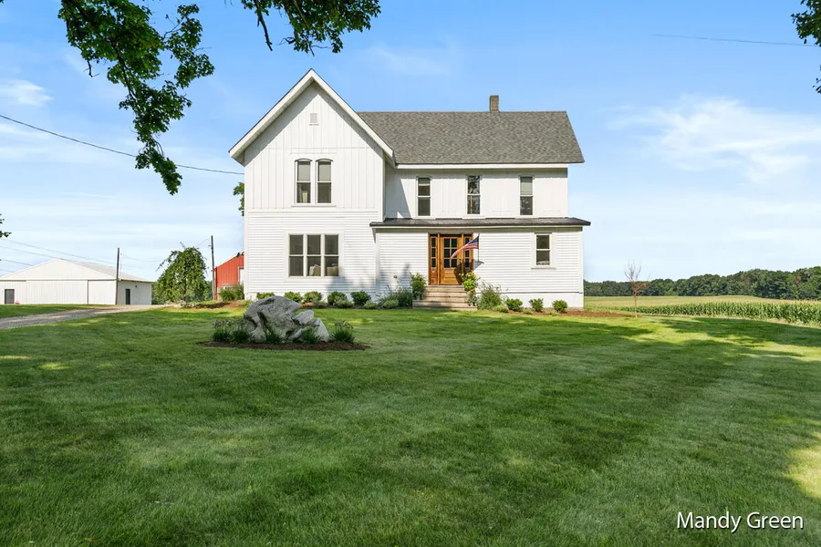 Country living at its finest! This beautifully updated 4 bedroom/2 bath farmhouse has 2 pole barns (28x40 and 25x60) and an attached 2-stall garage on just under 3.5 acres. 1 pole barn is finished on 1 side and the sky is the limit on what you can do with it! There is a fenced pasture area with chicken coop and this home is surrounded by fields and nature, the area is absolutely breathtaking! Home has NEW siding and garage door, updated roof, furnace, pellet stove, central air, windows, doors, kitchen, flooring and baths. Huge primary ensuite, main floor laundry and a waterproofed Michigan walk-out basement. This is a must see if you are looking for laid back peaceful living, schedule your showing today!