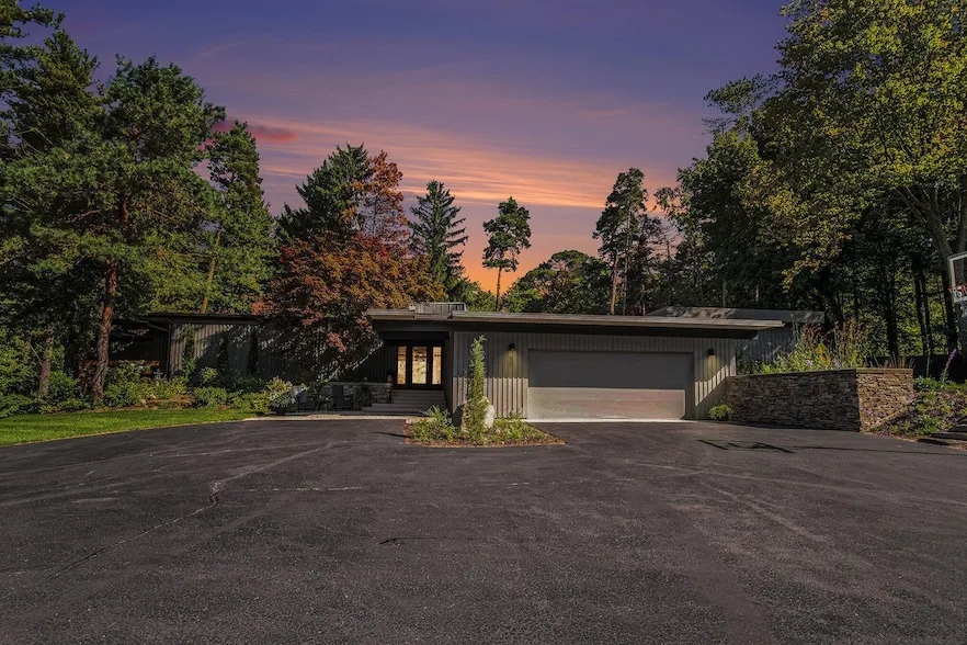 Step into timeless style and modern comfort in this stunning mid-century modern home situated on a high bluff with expansive views of surrounding white pine forest. Featuring expansive windows, brick interior walls with center fireplace, and open-concept living spaces. Natural light fills every room, highlighting the warm wood accents and seamless indoor-outdoor flow that define true mid-century design. A rare opportunity to own a piece of architectural history this home is 4 Bedrooms, 3 Full Bathrooms, office with private deck, and custom cabinets/built-ins throughout. Primary suites on both ends of the home that walk out to a 36' circular pool with newly built 40' long covered pergola, bar, and pad ready for a hot tub for exceptional entertaining. Lower level walkout is perfect for guests and entertaining with kitchen/bar, built-in bed, and fireplace. Zoned heating and central A. C. Two large sheds and newly installed native landscaping. The seller is a licensed Michigan Realtor. The owner completed $340,000 in renovations since 2018 including new roof in 2024 with R40 iso board, furnaces, A/C, mini split, 3' x 3' Italian tile, wood flooring, appliances throughout, pool pump and heater, epoxy pool in 2025 (8-10 year life), basement remodel in 2024, pergola in 2025 using patented clear UV "Cover Your Pergola" system, and native landscaping in 2025.