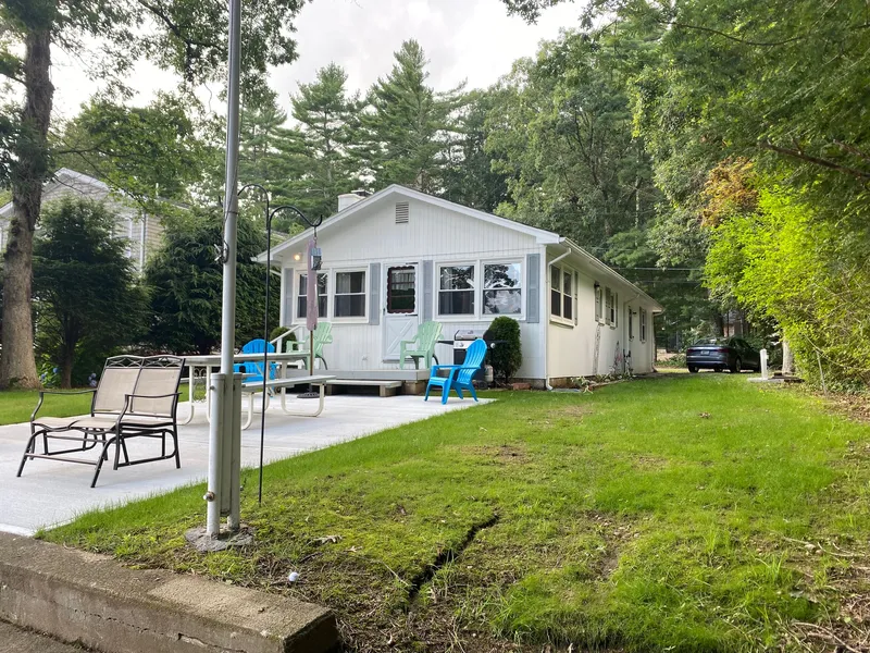 Waterfront year round home on Johnsons Pond. This home features one bedroom with an open kitchen/living room/dining area. Steps off the deck lead to a newly poured concrete patio, then to a sandy beach area. Great views from the water side of the house! There's a nice sized one car attached garage with the boiler and lots of storage with closets and shelves. The living room has a fireplace, and there is a stack washer and dryer in the bathroom. This would make a great year-round home, summer get-away, or rental! Swimming, boating, fishing, and a peaceful spot all in your back yard! House is on a cesspool.