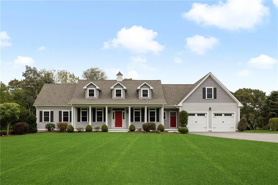 Nestled in the desirable Misty Meadows neighborhood of East Greenwich, RI, this stunning four bedroom, three and one half bath sprawling ranch-style home boasts a bright and sunny open floor plan with soaring ceilings, gleaming hardwoods and a soft inviting color palate. The main level features a spacious gourmet kitchen with granite counter tops, stainless steel appliances and a large island; seamlessly flowing into a generous living room with an inviting fireplace, truly the heart of this lovely home! Also on the main level is a sophisticated dining room and a spacious den. This home boasts a unique and thoughtful floor plan providing two separate wings for the bedrooms. Just through the living room are two generous bedrooms with ample closet space and an additional full bath. A private wing located on the opposite side of the home provides the perfect oasis for the stunning primary be...