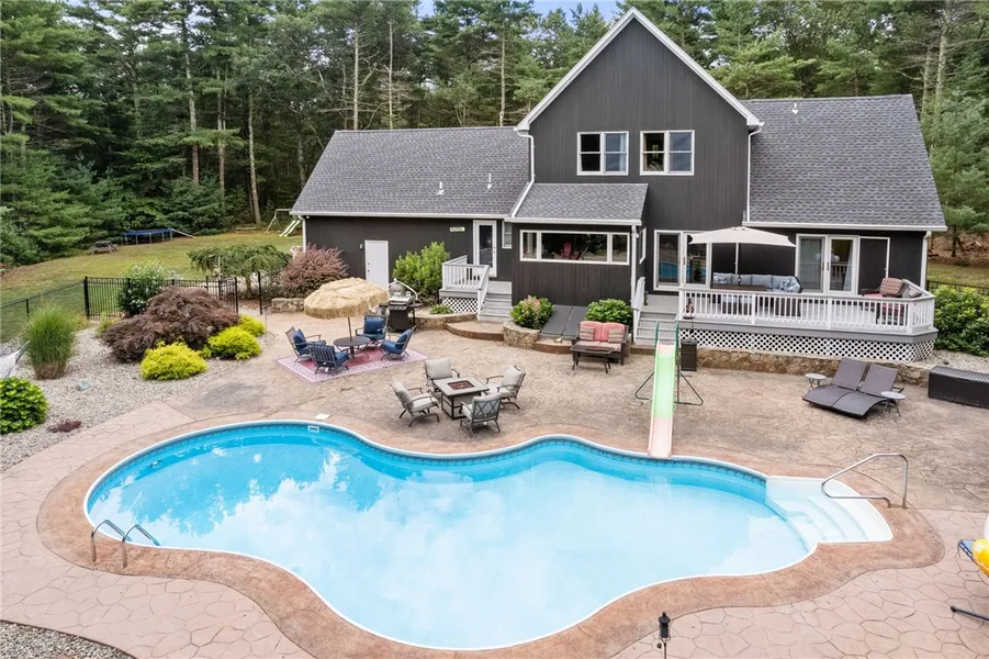 Absolutely Stunning 3 Bed, 2.5 Bath, 3,715sqft A Frame Contemporary on over 2 acres. What's better than a new build, but a 25 year young home that was built with quality construction by skilled Artistic Crafters and was then given a 5 year makeover to add modernization with rustic charm. Features include an open floor plan with a chef's kitchen including top of the line kitchen cabinets, stainless appliances, quartz counters and a large island. The spacious living room has a soaring cathedral ceiling with streaming bright light from the wall of glass windows. It has a 1st floor master bedroom with an attached amazing bathroom and a huge walk in shower. The upper level has two more bedrooms, a full bathroom and an office area. The lower level has a very nicely finished game room to bring the entire family together and another potential office or work out area, plus storage space. The backyard offers an incredible entertainment set up that includes a deck that overlooks an inground pool, patio, bar, beach sand area and firepit. In addition, there is a 1st floor laundry/mud/pantry room to keep everything tidy, a 2 car attached garage, a shed, new roof, a buderus boiler, central A/C, hardwoods throughout and so much more. This home has it all to create lasting memories! Come see if it speaks to you.
