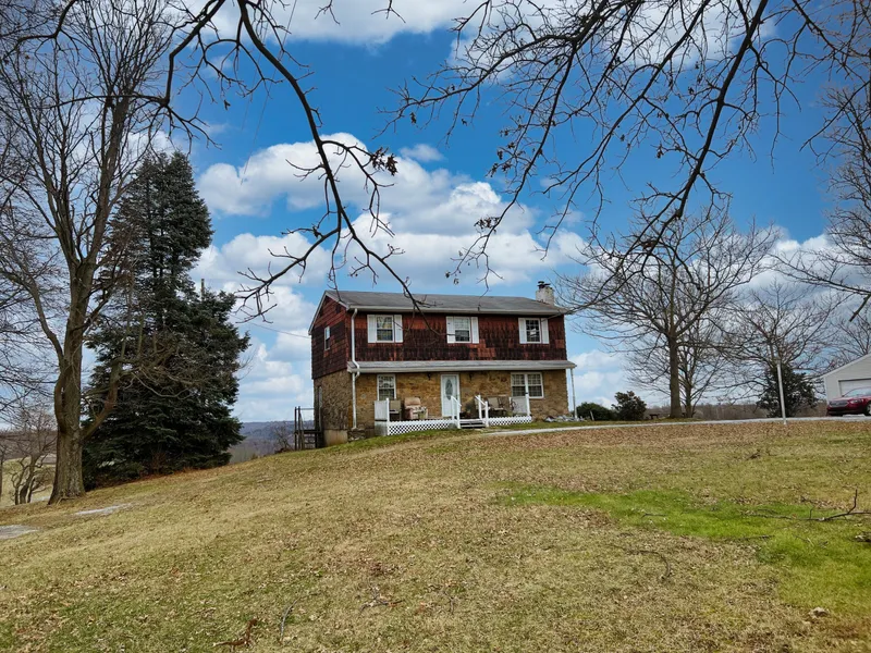 Spectacular Kenton county countryside views from this 5.8 acres. 4 bedroom, 1 1/2 bath 2 story stone and shake exterior. Has full, poured concrete basement. 2+ car detached garage and a small barn plus yard barn storage. Circle drive. House is nestled amongst mature trees on the south side to black the summer heat and wide open spaces on the north side with wide angle views of the countryside.