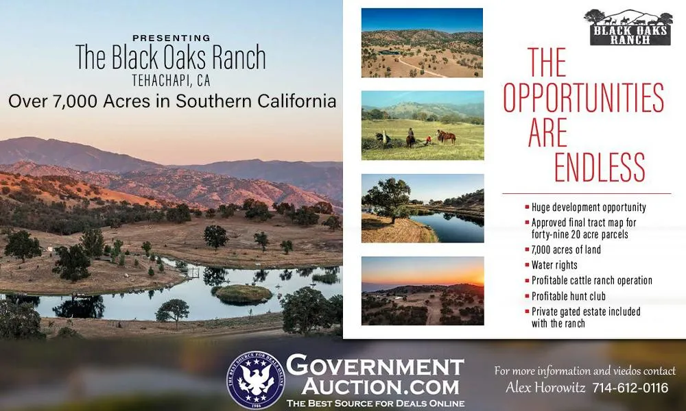 A once in a lifetime opportunity awaits you at the picturesque Black Oaks Ranch. A beautiful 7,000-acre private ranch in Southern California, sitting in the Tehachapi Mountains just 80 miles north of LA. Highlights include limitless views in every direction, multiple water systems, solar power, an abundant lake, horse and hiking trails, wildlife, cattle operation, hunting club, and development opportunities. Ranging from valley floors and mountain sides, this ranch has been lovingly developed and maintained. The entire property is fenced and has 23 miles of roadway as well as trails throughout, perfect for horseback riding, hiking, and off-roading. Black Oaks Ranch includes developed and natural water systems that provide for cattle, wildlife, and vegetation throughout the property. Solar powered water we...
