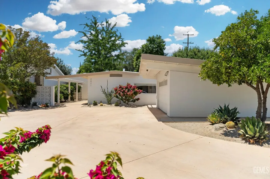 Mid-Century Modern Oasis--A Palm Springs-Inspired Time Capsule. Welcome to a stunning mid-century modern retreat in the heart of Bakersfield, radiating effortless style & charm of a Palm Springs getaway. This 2-bedroom, 2-bath home has original mahogany cabinetry meticulously restored to its glory & an abundance of natural light. The living room is inviting & iconic, w/mahogany built-ins & dramatic Pumice stone fireplace. The updated kitchen boasts crisp quartz counters & custom window shades, while thoughtful storage solutions are seamlessly integrated throughout the home. Step outside to experience a landscape designed w/intention--both front & back yards are finished w/decomposed granite, deep root irrigation & drip systems. A collection of desert-friendly plants & 7 mature fruit trees (2 lemon, 2 orange, 3 grapefruit) provide beauty & bounty, custom teak wood gates. Newer dual pane w...