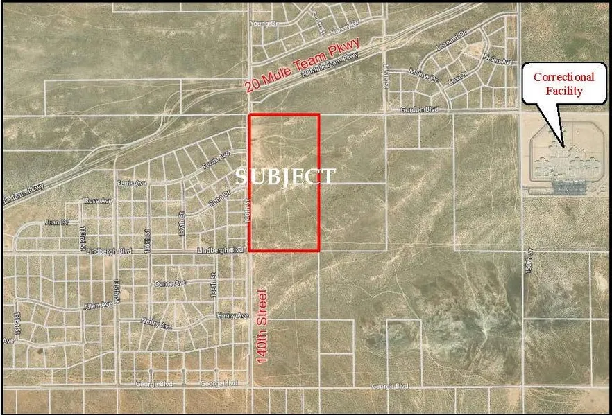 NEC of 140th Street and Lindbergh Blvd, south of 20 Mule Team Pkwy in California City limits. Potential agricultural uses, recreational uses, conservation/open space, cemetery, alternative energy, investment... Located near the California City Correctional Facility (CAC). Asking $2,200/acre.