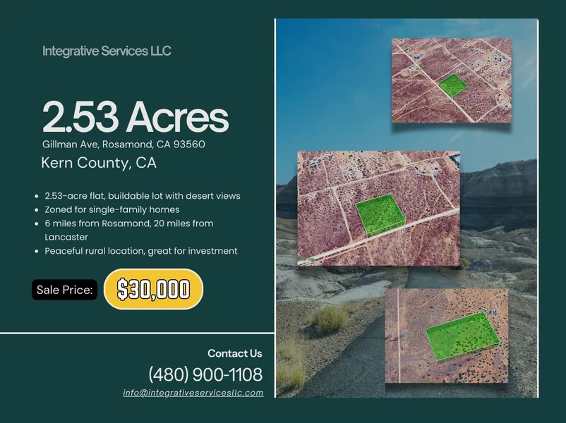 Escape the city and embrace the beauty of wide-open California skies with this 2.53-acre lot on Gillman Ave in Rosamond, Kern County. Set amid the serene Mojave Desert landscape, this property offers a peaceful retreat surrounded by panoramic mountain views, open terrain, and a quiet rural atmosphere — perfect for those seeking space and tranquility.