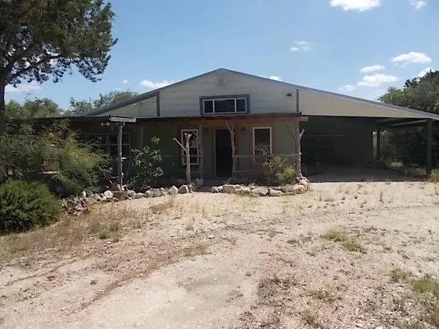 Nice small home with pretty stained concrete flooring thru out, high ceilings, lots of natural light, pretty light fixtures. Master bedroom has direct access to covered and open patio area, 2 large walk in closets, 2 individual vanities, large walk in shower with rain shower head. Spacious living room. 30x15 kitchen/dining/family rooms with wood burning stove, beautiful ceiling fans and high ceilings. Off the laundry room you will find a full 2nd bath with large walk in shower and decorator vanity. Covered deck on 2 sides, metal roof, rain water catchment system, and so much more. Lots of trees, partly cleared of cedar, perimeter fenced, workshop/storage with electric and an A/C unit. Gated entry. So bring your horses, other animals, children and make this place home.