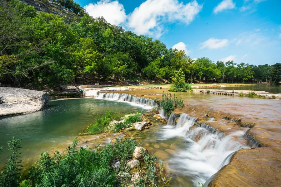Major League Live Water Ranch for sale in the Texas Hill Country. Johnson Creek Ranch is located just outside of Kerrville and is less then 1.5 hrs from San Antonio. This ranch has over 3,500 ft of frontage along Johnson Creek. This is one of the strongest and cleanest creeks in Texas. The water clarity is amazing and the beauty is unmatched. Johnson Creek remains mostly accessible for a long stretch and as it moves downstream over the falls, it lays beneath a towering limestone bluff that the creek has carved out over time. The waterfall on this ranch is like none we've seen. Truly a one of a kind that spans the entire width of Johnson Creek. Ownership of the creek is on one side. There is only one neighbor on the other side of the creek and the flood plain is mostly on that neighbor's side. This should prevent any construction near the creek on that side helping to preserve the privacy for the owner of Johnson Creek Ranch. The neighbors across the creek (to this point in time) very rarely visit their ranch.