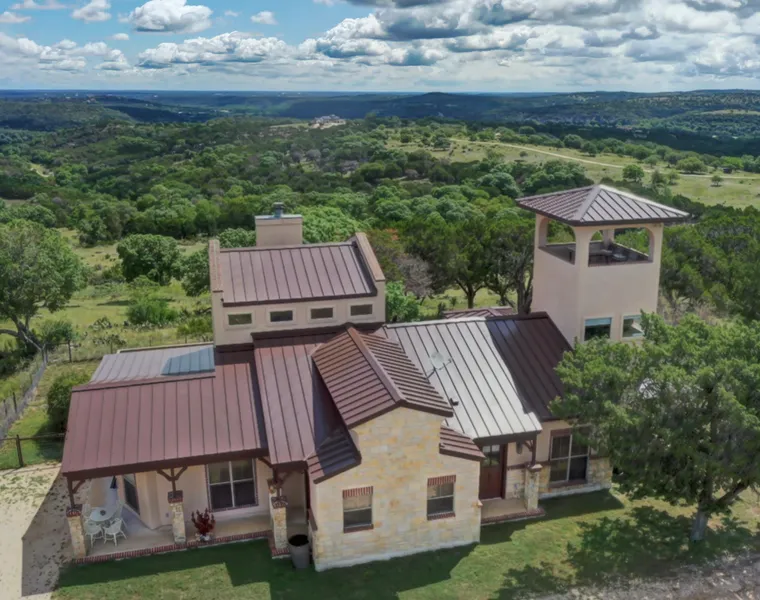360 DEGREE 'BIRDS EYE VIEW' OF THE BEAUTIFUL TEXAS HILL COUNTRY...WELL LOCATED HUNTING AND RECREATIONAL PROPERTY WITH A STUNNING 2500 SQ. FT. HOME AND 5000 SQ. FT BARN INC. APARTMENT AND OFFICE. High perimeter fenced, cross fenced, ag exempt rolling pastures to rugged terrain with rock outcroppings and mature hardwoods. Free Ranging Wildlife includes Whitetail, Axis, Blackbuck, Fallow, and Cattle currently roam the property. Private, yet convenient to all amenities. Other features include soaring ceilings, gourmet kitchen w/ high end appliances, dual bar area, butler pantry,/office, floor to ceiling rock fireplace, wet bar, utility with large amounts of storage, 3 bedrooms, 2.5 baths plus a library, and a viewing tower on the third floor. Extensive porches and decks for outdoor entertaining and enjoyment. Exquisite appointments throughout. The barn offers AC office and apartment, several...