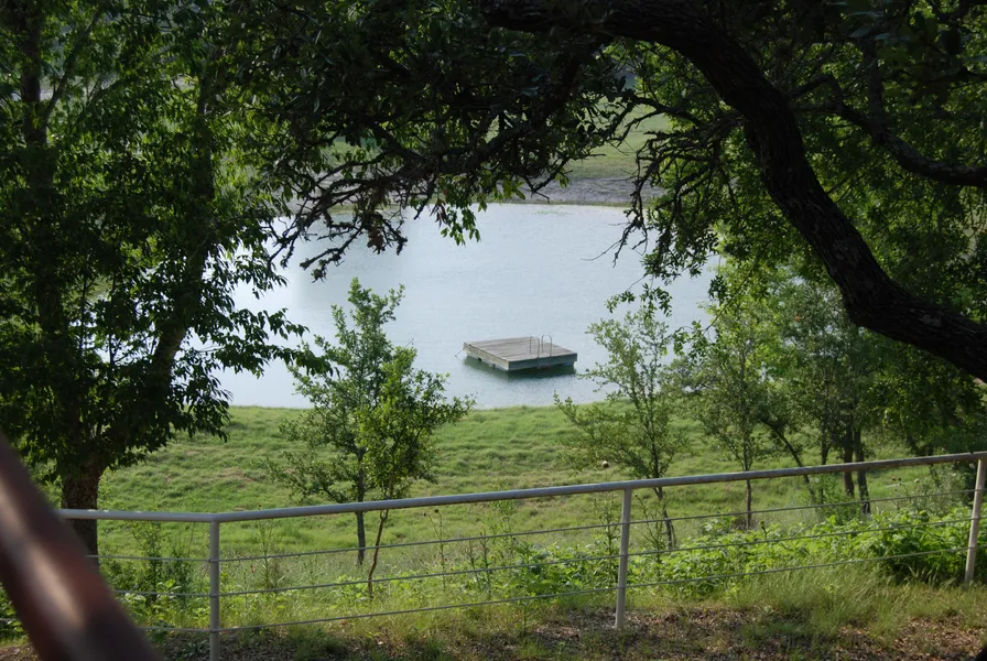 Hillside Home nestled in the Trees overlooking a lake with lots of Fish and Swimming. The home has three bedrooms, two baths and two living areas and an oversize Garage. Lush coastal field, White pipe Fencing. Lots of Axis, Whitetail Deer and Turkey. Beautiful setting just five minutes out of Kerrville.