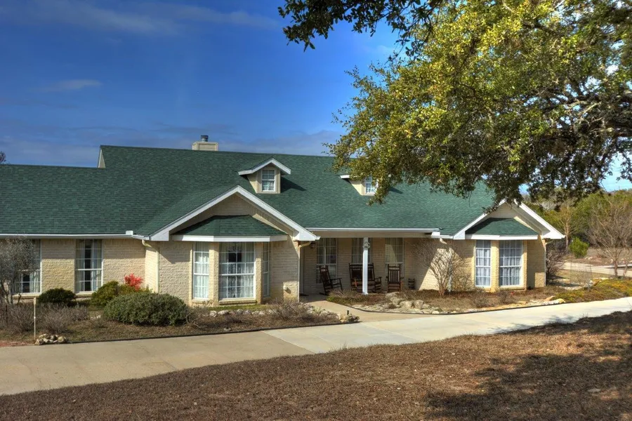 GARDENER'S DELIGHT!Set back from the street and accessed via a 100' long curved concrete driveway, this home was designed to offer a sense of grace outside and in. Beautifully landscaped, it features a terraced formal garden in back with 19 raised beds and wrought iron fencing that opens to the rear acreage and the seasonal creek, with a covered porch and breezeway, for outdoor living in a serene environment. Inside you'll find every convenience, with formal living and dining rooms plus a great room and sunroom divided by a double-sided fireplace, a huge kitchen with two pantries, stainless steel appliances and a breakfast area, and split bedrooms. Upstairs, the large guest suite with full bath provides privacy and comfort; all other rooms are on main level and wheelchair accessible.