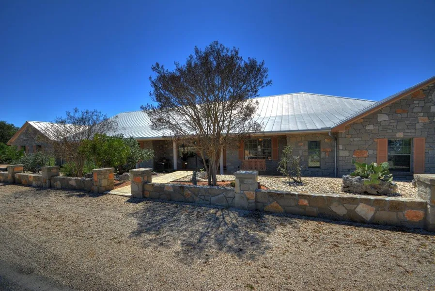 Impressive stone design w/standing seam metal roof w/complimenting front stone fencing & smart Xeiscape lawn/landscaping. Grand foyer w/stone archways lead to office/study complete w/built-in stained cabinetry. Living features built-in bookcase & wall of windows/doors leading to back deck w/wrought iron railing. Kitchen is well-appointed w/stainless appliances, island, pantry, breakfast area, & convenient to an airy dining room. Kuykendall Construction crafted addition/greatroom to include wood barrel ceiling wet bar area, wood beam & wood cathedral ceiling, stone fireplace flanked by French doors, surround sound inside/out. Private master suite w/stone wall, stepped up ceiling, 2-way fireplace, soaking tub, glass block window, sep shower, sep lavatories. En suite guest bedrooms. VIEWS!