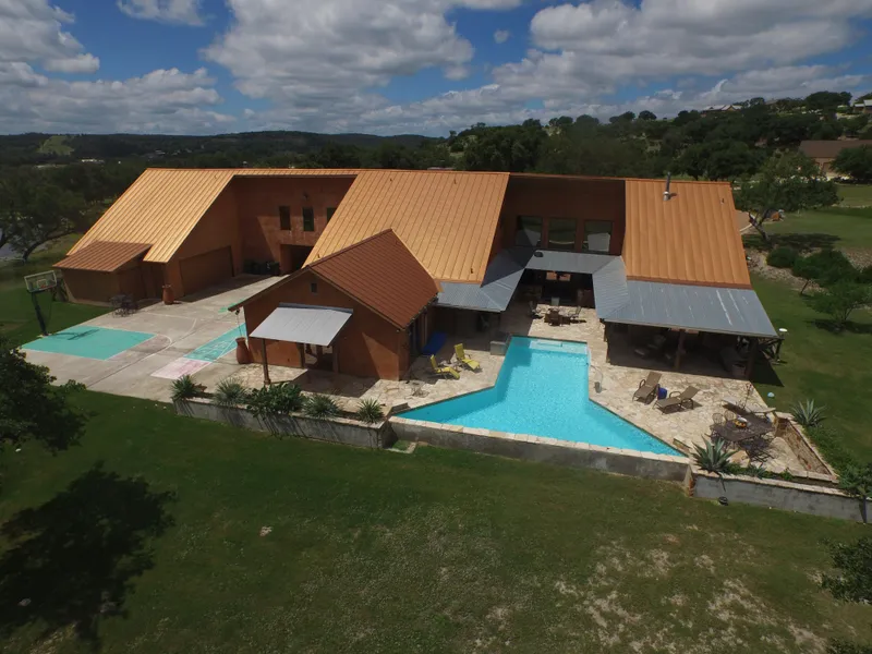 Distinctive stucco/stone/standing seam, Western/Texas Country design built on sprawling 5+ acre estate. European style gravel circle drive w/stone accents & boulders, mature trees/landscaping, natural grasses, pool w/waterfall/spa, firepit, covered outdoor kit/bar, basketball court/shuffleboard/batting cage. Focal point double-sided stone fireplace w/live Cedar beams on shed ceiling in liv/kit/din 2 copper farm sinks, 2 dishwashers, 2 compactors, stainless exceptional appliances, & special feature lighting. Live Cedar beams appoint shed ceiling in master ste w/double-sided fireplace, built-ins galore in closet, stainless sinks/tub/toilet, butted glass vanity, 3 sets dbl doors lead to exterior. Sizable gst baths;gst beds w/dbl doors lead to exterior. Media rm & #4 bed/bath on second level.