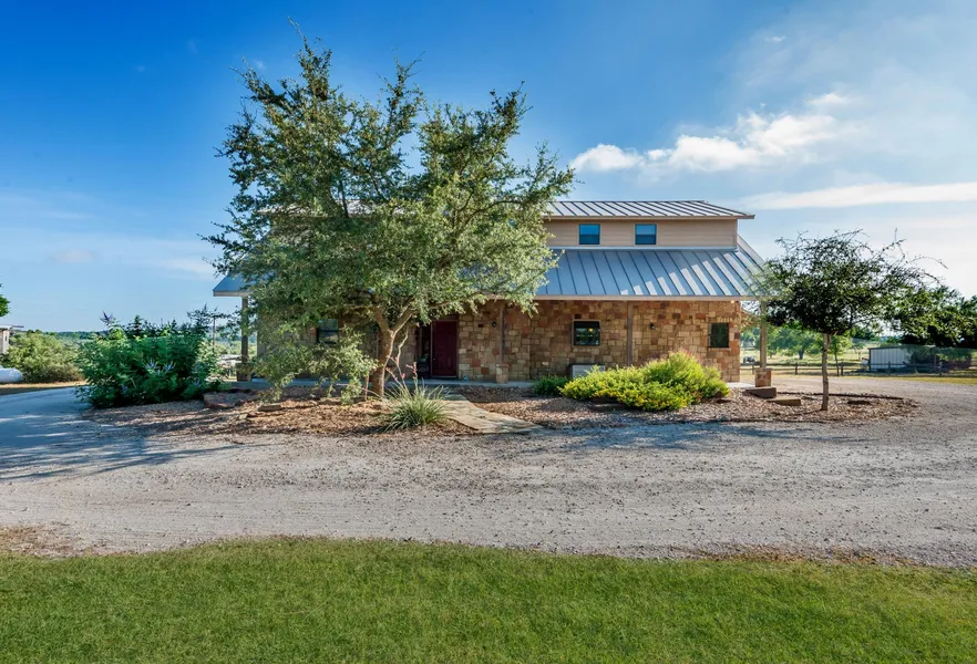 Beautiful 3/3 home sitting on 8.744 AG exempt ac! This property has a rock home w/ a metal roof, covered front/back porch, rock fireplace in the living room, game room, media room, master down with secondary bed with full bath or office down, Island in the kitchen, Double vanity w/ separate tub and shower in the master bath, Extra large HVAC room with great storage. Bring your horses or other animals.. 3 stall loafing shed, panels for an arena w/ Poteet sand in place, Well w/holding tank, fenced and gated!