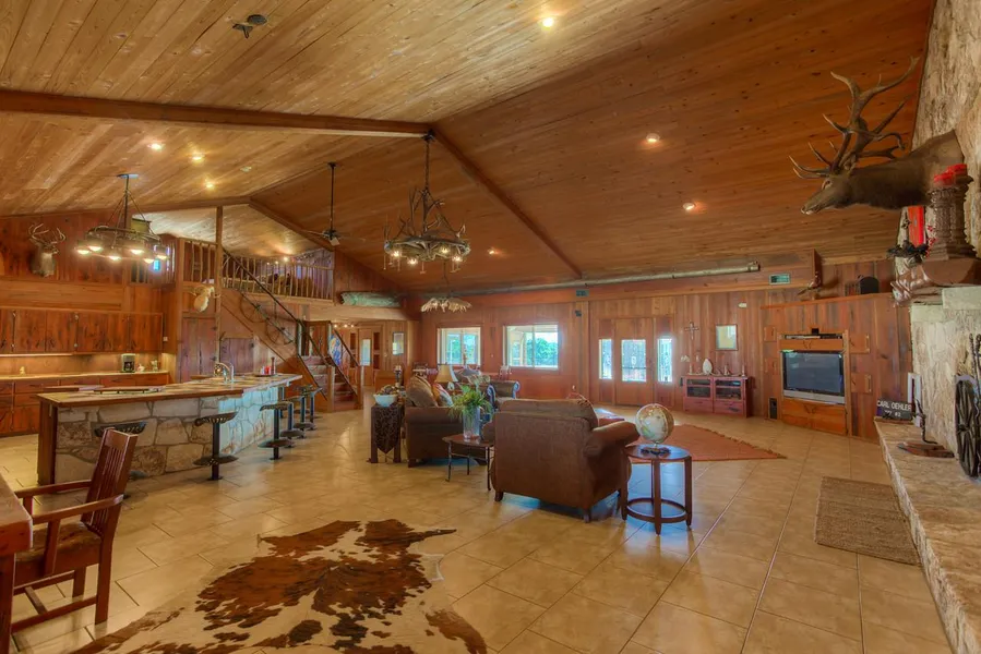 Quality-craftsmanship built home on 43 ag-exempt acres, high fenced perimeter & a hill country view. Exterior of home built to resemble a countryside barn with warm interior, cypress wood, high ceilings, limestone rock wall with wood-burning fireplace, 3 distinctive chandeliers that were custom made for home. Enjoy evening breezes on back patio, enclosed outdoor kitchen with gas stove & fireplace.