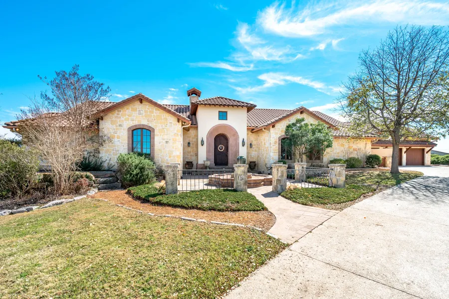 Main House: Custom Texas/Tuscan, rock and stucco, clayed tile roof home was designed by Mickey Thompson with 3435 +/- sqft. Open floor plan and tall ceilings with beams, a large wood burning fireplace and views from the wall of windows along the back of the home is absolutely breathtaking! There are three bedrooms, three baths and a three car garage with loads of storage above garage. The kitchen offers a bounty of cabinets, walk-in pantry, warming drawer, two dishwashers, Sub-Zero stainless refrigerator and expansive island with prep sink, large wine refrigerator and reverse osmosis. The covered back patio stretches the length of the home and is perfect for entertaining and dining under the Texas stars. Just a few steps down from the porch is a koi pond and sunken fire pit that is perfect to gather around as the fall weather moves in to the Hill Country. There is a trophy room/office that has three-quarter inch plywood behind the walls to accommodate mounts, adjustable lights to highlight your artwork or trophy. The home offers a Control 4 System in every room with speakers. There is a central vacuum system and in-wall pest control.