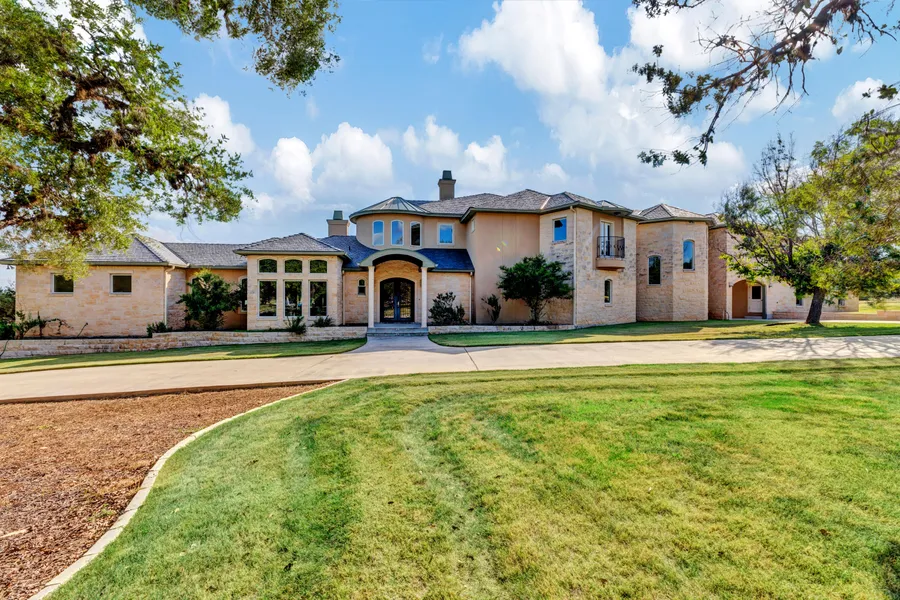 Truly one of a kind Hill Country estate home on 41.56 acres. Every detail & feature was carefully designed & chosen. On the impressive exterior facade, 7 sizes of hand cut Big Spring stone, durable slate-look resilient composite roof & porte cochere leading to a rear-entry 3 car garage. Custom double glass & iron doors lead into grand entry hall w/curved stairway. Great room w/spectacular dbl height windows & pillars supporting a modern railed 2nd story gallery, overlooking the waterfall accented pool w/ dual tubs-1 hot, the other refreshing & shallow, a huge patio & expansive view beyond. 200 bottle wine cooler, wet bar, dining & open, isl kitchen w/stunning granite, dual sinks & high end SS appliances create fabulous aesthetic & flow for living & entertaining. Owners suite has roomy sitting area w/fireplace & dual WI closets. Ensuite w/partner-style dual vanities, soaking tub & glass s...