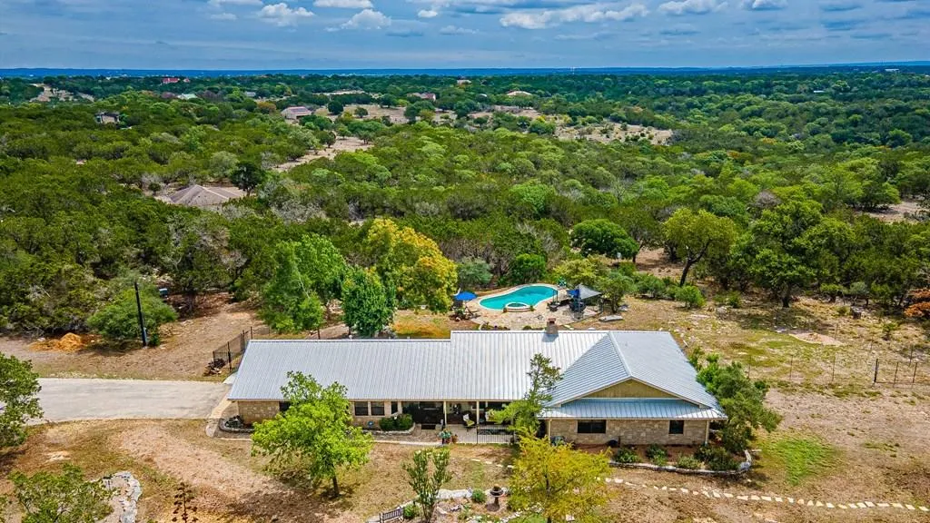 This classic tradition Hill Country home offers three bedrooms, two full bath and a half bath in the main house on over five acres. The home offers a complete renovation in 2017 with new roof, windows, hardwood and tile flooring. The high end finishes in the kitchen with new appliances and beautifully done baths add to the beauty of this private setting. The guest house barn dominium offers another two bedrooms that are currently used as an office and studio. A full bath and tons of storage make this guest house complete. A walk outside reveals an outdoor space that is very private and its own get away. Complete with a pool and hot tub, this home overlooks the valley. This home is a must see in the wonderful community of Bear Paw Ranches.