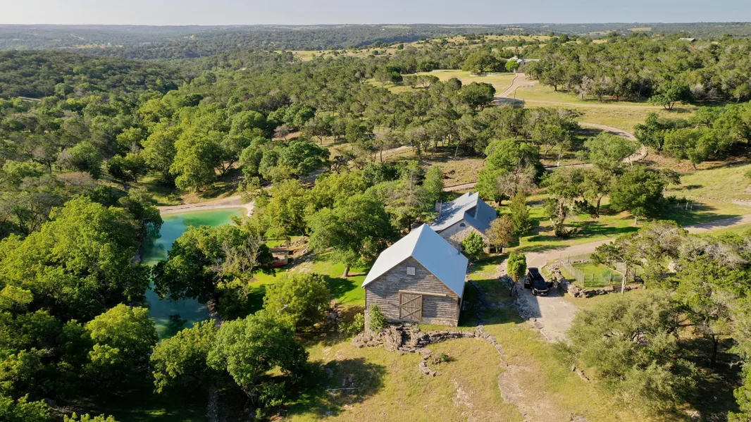'A TRUE TEXAS HILL COUNTRY MASTERPIECE' 100.5 Acre Premier Estate boasts a 4 Bed/3 Bath Main house, outdoor dining/kitchen, 2 screened porches, fire pit, 2 Bed/2 Bath Guest house overlooking a spring fed lake, deep covered porch, rock patio on the the lake, Caretakers quarters, studio, two - 1700 Historical 'Dutch' Barns, one being a party barn, the other a horse barn, spring-fed lake, golf course with putting green, property adjacent to the 3000' airstrip. Other amenities include: Tremendous views, dramatic topography, horse friendly acres, fenced area for animals, beautiful hardwoods, HOA Guadalupe River Park w/2200' both sides of the Guadalupe, pavilion and more. Private airstrip, Common guest cabins for overflow guests. Prestigious gated, large acreage ranch community.