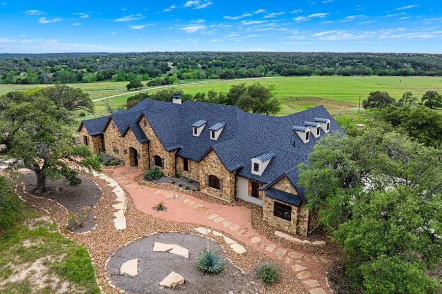 Luxury Hill Country Estate! This 35 +/- Ag exempt acreage offers an exquisite home w/3 bdrms, 3 full bthrms, & 2 half bths. The living area w/18 ft ceiling, kitchen complete w/top of the line appliances-wolf gas range & sub zero fridge, formal dining room, breakfast area, bar, & office provide ample space for comfortable living. An expansive primary suite features garden tub & walk-in shower. Two spacious guest rooms each w/ensuite baths. Walled picture windows framing the home boasting stunning views. Finishes include granite countertops, white oak wood floors, & travertine tile. A 4-bay garage w/charging station & 1/2 bath. Outdoor amenities include a covered patio w/a built-in BBQ, flagstone patio w/a fireplace, pizza oven, & expansive views. The property features perimeter fencing, 20 acres of Klein grass & native vegetation including pecan, black walnut, native cherry, Spanish & liv...