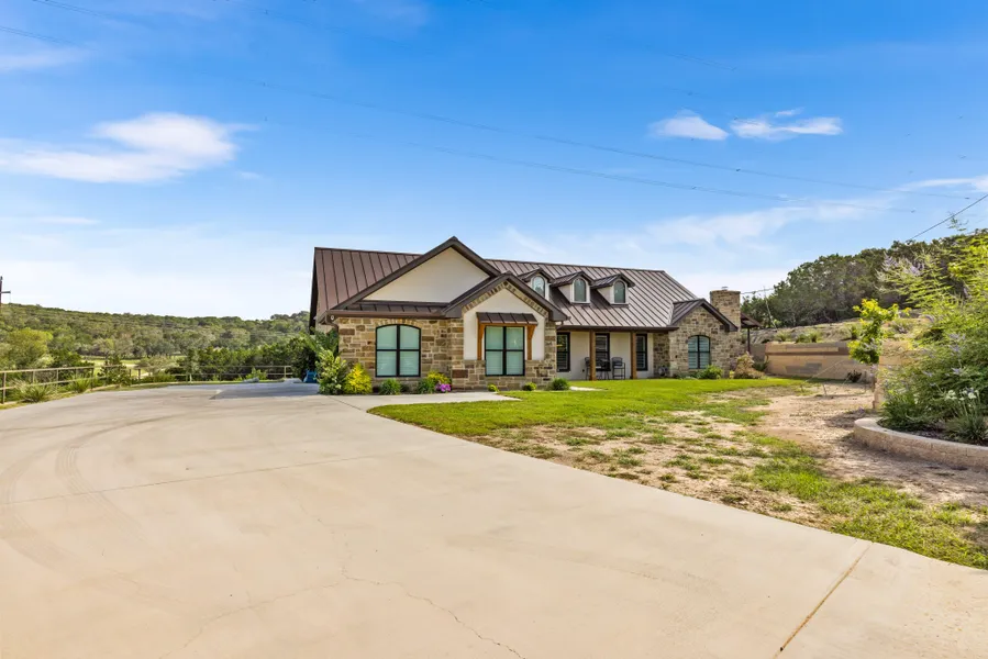 Diverse property with stunning hill country chique home and 4500+ square feet of workshop perfect for a business operation. The home features beautifully appointed kitchen with gas range, center island, open concept. The living room cathedral ceiling is centered by a dramatic fireplace flanked by built-in cabinetry. Primary suite includes luxurious bathroom and large custom closet. Entrance into the laundry room from the hallway and the primary closet. Large walk-in pantry off of the hallway. Plantation shutters throughout. An outdoor living space with fireplace to enjoy hill country scenery. One bedroom one bath plus office guest suite with covered porch adjoins the workshop. Water catchment systems for both house and shop. 30000 gallon storage for the house and two 2500 gallon tanks for the shop. Partially fenced three sides. Room for trailer parking and 18 wheel truck in the shop yard. All drapes do not convey.