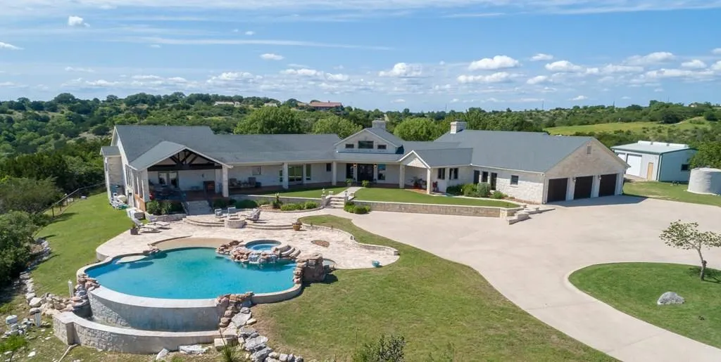 You will never tire of the spectacular views from this hill top ranch tucked away in gated Creekwood Estates. Overlooking the pool, you will find miles of tremendous hill country and water views. This spacious single level home has 4 bedrooms and 4 full baths with 3 living areas, 2 dining spaces, wet bar with wine fridge and ice maker and a large gourmet kitchen. This home is perfect for entertaining both inside and out with 2 indoor fireplaces and 1 outdoor fireplace and fire pit. Wonderful details include wood windows, wood interior doors, steam shower, large closets, 3 HVAC units, 3 hot water heaters, 500 gallon propane tank, barn, outbuilding, fence, concrete driveway and much more. Want to feel like you are out in the country but still convenient to everything, this is the perfect place! It is just minutes away from HEB, shopping, medical, and the airport.