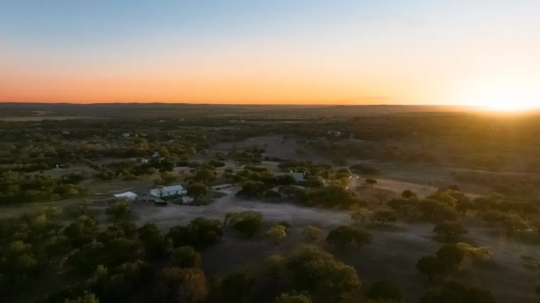 A charming ranch style home and guest house adorned with limestone sit proudly on a hill, surrounded by manicured eclectic landscaping and curated cactus gardens. Panoramic views sweep across the 60 acres of elm, live oak and cypress trees with a wet weather creek greeting you at the entrance.