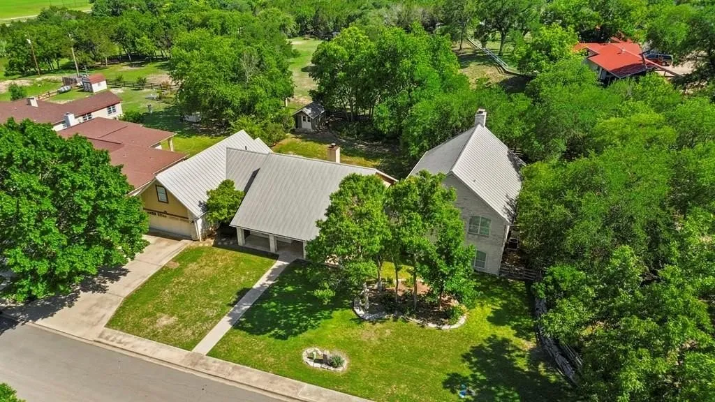 Price just improved-your dream home is now an even better value! Nestled in desirable Bluebell Estates, this stunning white stone home spans two residential lots, offering the perfect combination of in-town convenience & the serenity of country living-just a short walk to scenic Town Creek, ideal for kayaking & fishing right out your back door. Step inside to find beautiful hardwood floors, two stone wood-burning fireplaces, with custom built-ins throughout. The chef's kitchen is a culinary dream, featuring a built-in KitchenAid refrigerator, Wolf range, built-in KitchenAid oven with warming drawer-perfect for family meals or entertaining. The luxurious primary suite includes a spa-like ensuite with a frameless glass shower, soaking tub, & a closet with floor-to-ceiling custom built-ins. A second bedroom & full bath on the main level offer flexibility for multi-generational living. Entertain with ease on the oversized flagstone-covered back porch, complete with an outdoor kitchen. Your perfect Hill Country lifestyle awaits!