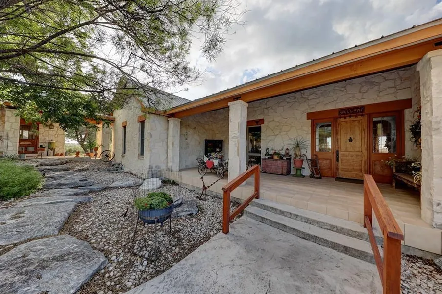 If you are looking for a classic design in a Texas Hill Country home, this is it! All outside walls and columns are native rock, which is also found inside the home. The carved front door sets the tone and leads to the raised ceiling of the great room, with a beamed starburst design. Each of the 3 bedrooms are ensuite and are treated with different motifs. There is an abundance of storage throughout the home. The spacious deck across the back of the home is half screened and half open air. The view is unsurpassed and is true Hill Country to the horizon. Per KCAD, the house is 3494 sq. ft. and the charming apartment is 442 sq. ft., with an additional bedroom, full bath & kitchenette. It's a perfect pleasant spot for your guests This property is a 'must see'!