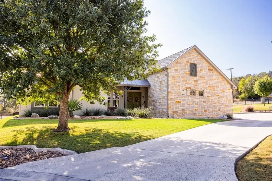 Lovely stand alone German Cottage in Comanche Trace with no shared wall on a large 0.28 acre lot. Open floor plan with vaulted ceiling with beams and fireplace in great room as well as outdoor fireplace on covered patio. Primary suite has spacioius bathroom with walk-in shower and large walk-in closet. Tile floors throughout and tiled front porch. 2 1/2 Car Garage with separate door for golf cart. Garage has direct access into the house. This home is located in a yard-maintained neighborhood. HOA maintains yard for $2445 annually. This home is move-in ready! Comanche Trace is a master-planned community with many wonderful amenities including private Guadalupe River park, crushed granite walking trails, stocked fishing lake, community garden and more. Golf and Social Memberships are available for a separate fee. Come for the views and stay for the lifestyle!