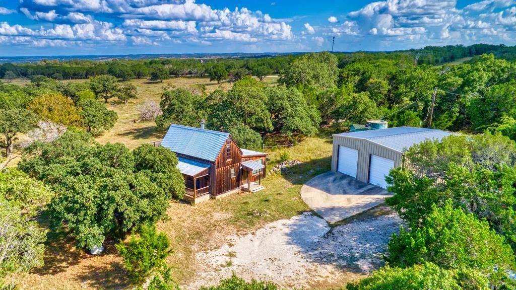 Check out this quiet peaceful place on 5 acres just south of Kerrville. It's a small acreage tract with a neat cabin style home and an awesome 30' x 36' steel framed building. The home has 2 bedrooms and 1.5 baths with the master bedroom upstairs with the full bath. There is a rooftop deck for enjoying the stars at night or the distant views. The shop is suitable for a variety of uses with room for a great work shop and 2 overhead doors for parking or storing equipment. Water is provided by Aqua Texas and although there is an old well and storage tank on this property, they are currently non-functional.