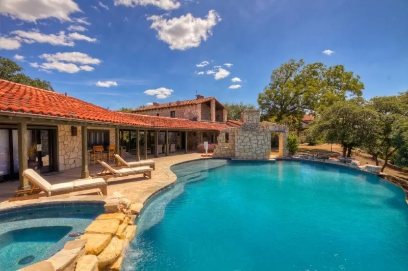 Gorgeous home overlooking the Guadalupe River and Flat Rock Creek. Five bedrooms, five and 1/2 baths, pool area on the bluff with enclosed party area and full bath, and outside BBQ kitchen. Many other improvements including a 32 stall rock horse barn and arena, two cottages, and 3-2 foreman's home. This wonderful property has good road frontage on two paved roads.