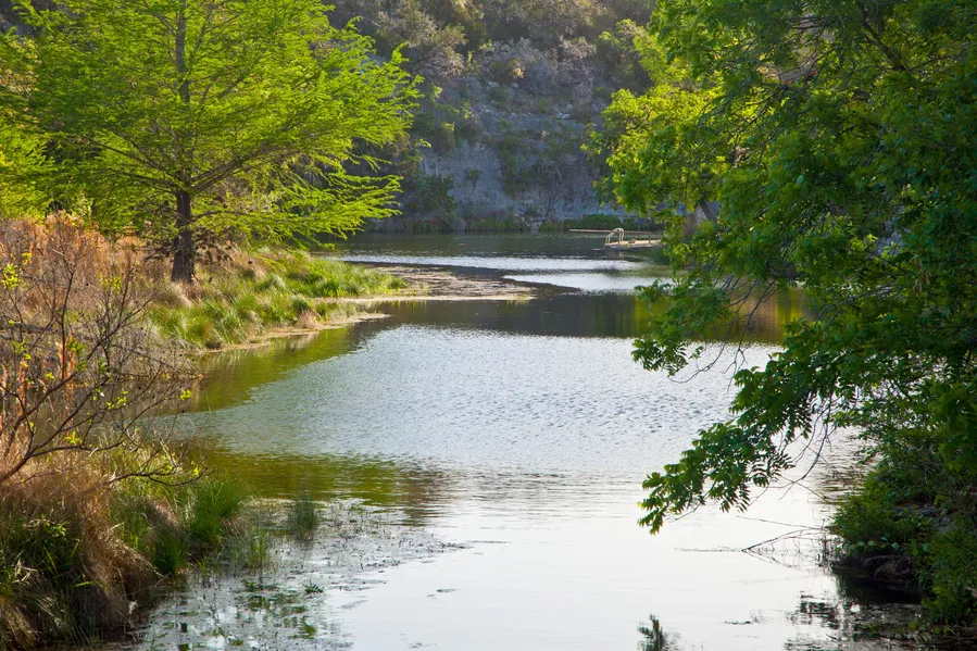 Spring Lake covers about 3 acres, and lies in one of the most spectacular water settings weve seen. Backed by limestone cliffs on one side, the cool lodge is landscaped into the opposite bank, facing the cliffs, with total privacy and serenity. This lake is over 20 deep, and is host to unusual aquatic life including freshwater jellyfish! Huge bass and catfish are harvested regularly, and one can literally cast from the house patio!