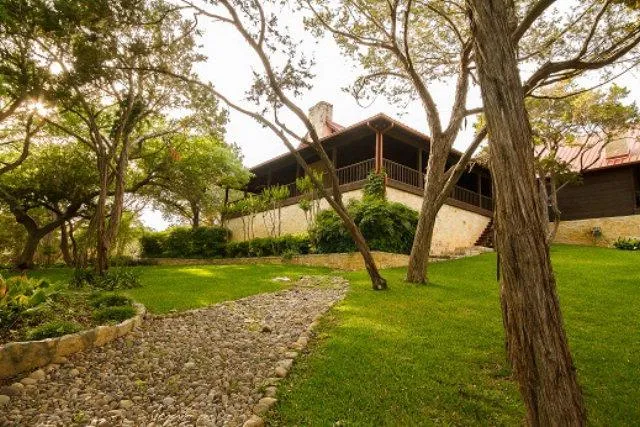 HERITAGE ELEGANT TEXAS HILL COUNTRY ESTATE...Private gated entry winds into manicured, landscaped grounds & stone-lined walkways. A quintessential masterpiece of design and craftsmanship features sprawling wrap-around porches, double entry doors leading into the magnificent great room, cypress lined walls, heart-pine, plank wood flooring, antler chandelier, massive rock fireplace clad with Givens Custom Wrought-Iron Fireplace screen. Gourmet kitchen with top-of-the line stainless steel appliances & cypress lined bars. A stunning Hutch graces the elegant dining room made for entertaining with a door opening to the porch. A premium WINE CELLAR showcases brick pavers, tin ceiling, & cypress walls, offers a dedicated space for the safe storage & preservation of your collection of fine wines. Exquisite Master Suite boasts a soaring, exposed beamed ceiling, spacious his and her separate baths, generous closets, & joins the study and den with fireplace, off of the guest room and a private porch. The Charming open concept guest house has a full kitchen, rock fireplace, 2bed/1bath, & a screened porch. Other amenities: Enclosed Swimming Pool, Greenhouse, Garden, Workshop, & a 3 Car Carport.