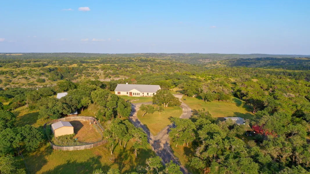 A RARE OPPORTUNITY TO OWN SMALL ACREAGE SURROUNDED BY A LARGE RANCH AND UNOBSTRUCTED VIEWS FOR MILES. For the discerning buyer wanting total seclusion off the beaten path, this custom built hill country rock home is ready for its new owner. The massive great room boasts a floor to ceiling stone fireplace with nice built-ins and a wet bar for entertaining. The great room opens to the kitchen with granite counters throughout, double ovens, walk-in pantry, large bar, and a breakfast area. Other features include a spacious formal dining room, large office with built-ins, big laundry/mud room with abundant storage, upstairs bonus room and additional climate controlled storage. The split floor plan boasts oversize rooms with the primary suite offering two walk in closets with built-ins, jetted tub, separate shower, dual vanities, and a sitting area. Views can be enjoyed from the back of the home and the expansive covered porch is ideal for relaxing and entertaining. The barn is the perfect set up for stock show animals, horses, and other livestock. Call for a showing on this beautiful home today.