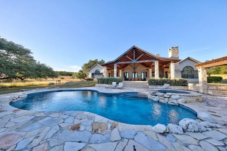 BIG TEXAS SKIES AND VIEWS FOR MILES~THE 100 ACRE 'OLD OWL RANCH' has served as a wonderful family compound for several years. Wind through the secluded ranch to find 3 homes: 3071 SF main, 1901 SF charming GH 2/2 car garage, 743 SF cottage/studio, 20x22 workshop, storage w/2 car carport, & equipment barn. Located in the desirable gated Comanche Caves Ranch, an 1800 AC high fenced development with 100+/- AC parcels. Amenities include: gorgeous Guadalupe Riverfront w/pavilion and patios, 3000' landing strip, 3 guest cabins. The custom stone MH boasts high quality craftsmanship throughout. The great room offers a high cathedral beamed ceiling, wall of windows, massive rock fireplace with built-ins, 3 Bed/3 1/2 Ba, beautiful kitchen, large bar, gas cookstove, granite, extensive storage and opens to spacious dining room with antler chandelier & arched windows viewing the expansive outdoor living space BBQ, FP, pergola, pool & hot tub.The charming GH offers 3 en-suite BR, a loft, outdoor kitchen w/FP, high fenced yard/garden & forever views! The cottage/studio/office has apt. kitchen 2B/1 1/2Ba. FURNISHINGS ARE INCLUDED IN THE SALE. SEE ADDITIONAL DETAILS. EXCEPTIONAL PROPERTY!!