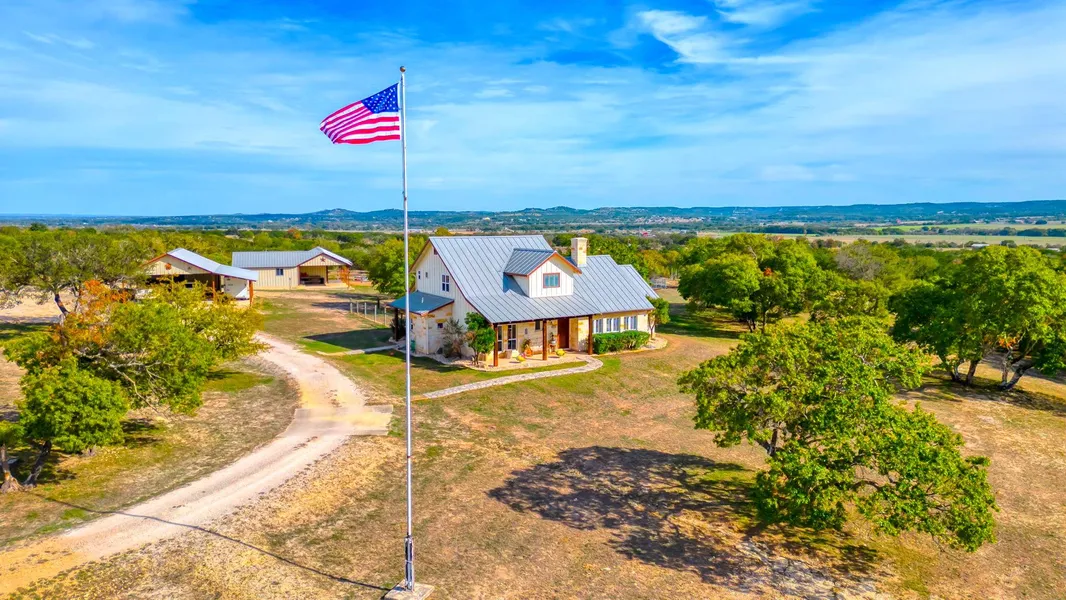 Perched perfectly atop a hill, Comfort Hilltop Escape embodies the essence of Texas Hill Country living. Built in 2007 by Elsworth Custom Homes, this 2528-square-foot, four-bedroom, three-bathroom stone home exudes a charming blend of Hill Country style and French country elegance. Almost fully remodeled inside and out with a standing seam metal roof, exposed wood beams, herringbone ceilings, authentic French accents, and a large rock fireplace create a welcoming ambience. While outside, a 2-stall horse barn with a tack room and attached shop, a round pen for horses, and a detached, oversized 2-car carport with a covered lean-to offer ample space for trailers and surplus parking. Enjoy quintessential sunrises from the back porch overlooking the Guadalupe River Valley and Texas sunsets from your front porch rocking chair.
