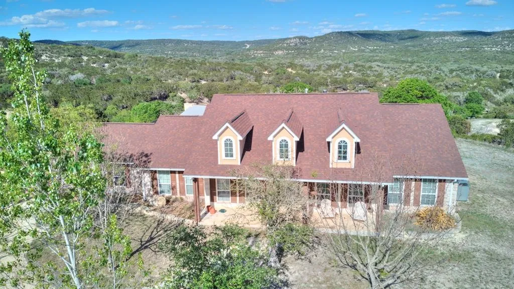 24+/- Acres! Views, Peace, Quiet, Breezes! If you are in the market for a beautiful slice of Texas, this is for you. Wonderful home with a light, airy feel in the kitchen, great room, dining room and office. Open, relaxed floor plan for entertaining. Or, take your entertaining to the covered back patio or beyond to the amazing pavilion with open beams, fireplace, sliding wooden side doors, and a bar with seating. Also a fire pit perfect for s'mores and star gazing. A true hill country experience as you look out on the rolling hills around you. The home also offers three comfortable bedrooms with high ceilings. The primary bedroom has a large walk in closet and a bath with two vanities, a large soaking tub and a separate shower. Home is move in ready with neutral colors waiting for your decorating choices. Outside there is a great oversize workshop with additional covered parking and another shed for work vehicles or storage. Watch the Texas wind blow with a windmill and adjacent tank for water collection. This is an outstanding Hill Country property not only can you enjoy views but there is plenty of level land for livestock grazing or hunting. Wildlife exemption in place.