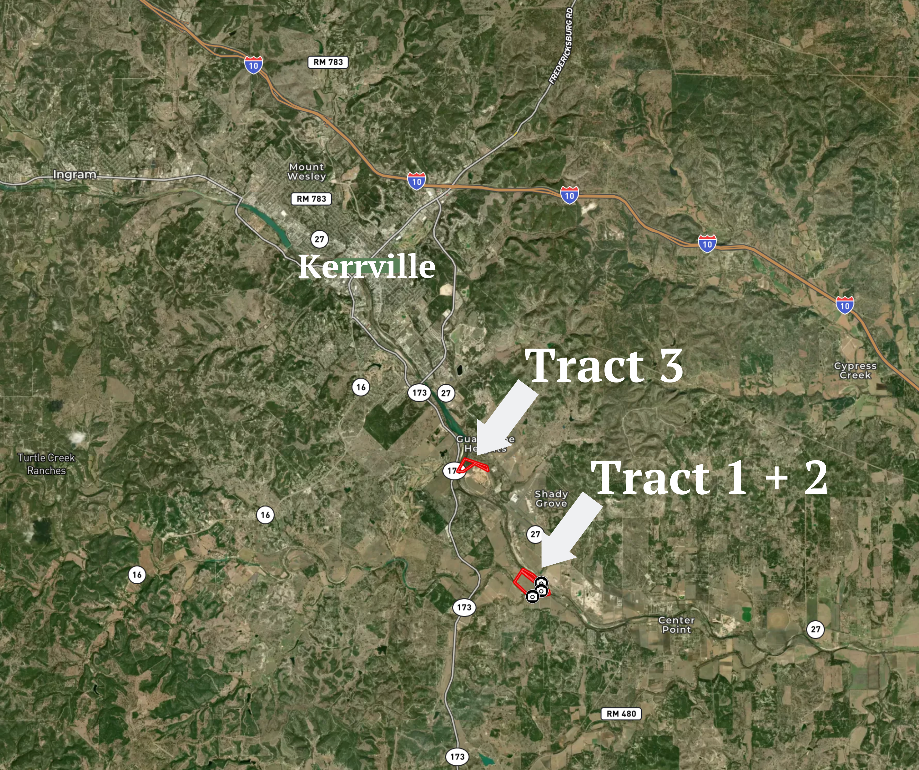 Tract 1 & 2 of the famed Shelton Family Real Estate Portfolio are AVAILABLE! Located in Kerrville, Texas along the Guadalupe River and Turtle Creek, these two tracts are some of the most desirable pieces of Real Estate to hit the market in the Texas Hill Country. Tract 1 comprises 21.876 +/- acres with 3,306.2 feet of gorgeous frontage on the famed Guadalupe River enhanced by towering cypress trees. Tract 2 comprises 105.51 +/- acres with 4,283.3 feet of attractive frontage on Turtle Creek that is also adorned with massive cypress trees. Tract 1 & 2 sit directly across Center Point River Road from each other. These pieces of the Shelton Family Legacy WILL NOT LAST LONG as they both boast usable topography and unique water frontage that make them the ideal location for a luxury homesite, large acre subdivision, event venues, RV Park, or other development opportunities. Tract 3, a short distance away on the Guadalupe River, is also available.
