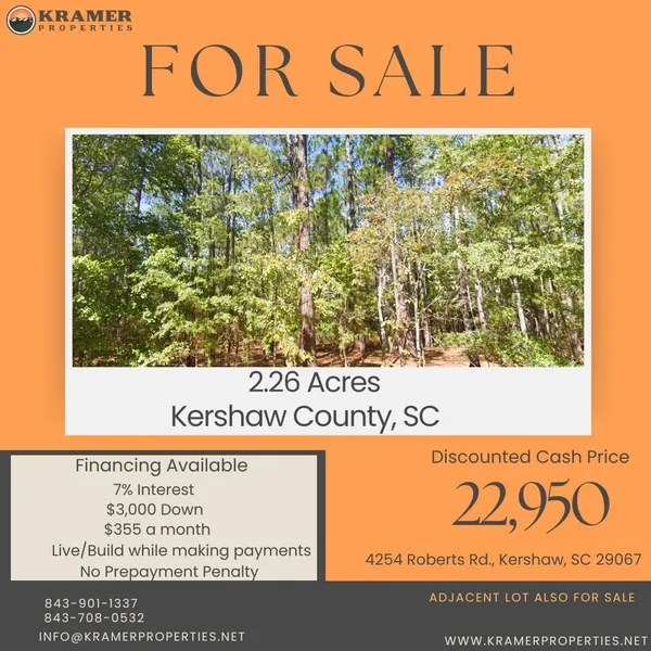 This 2.26-acre lot, 10 minutes outside of Kershaw SC, could be the ideal property for you. With no HOA restrictions, you have the freedom to build the site-built home of your dreams, place the perfect manufactured home, or build a unique barndominium the choice is yours!! You'll also have plenty of space left over to fulfill your backyard hobbies and dreams - animals, fenced-in areas for the kids to play in, gardens and etc. There is power running at the street - water available for hookup - septic needs installed. Don't let this property slip right past you!! Seller Financing Available - Live or build on the property while making payments with our easy financing option!!!