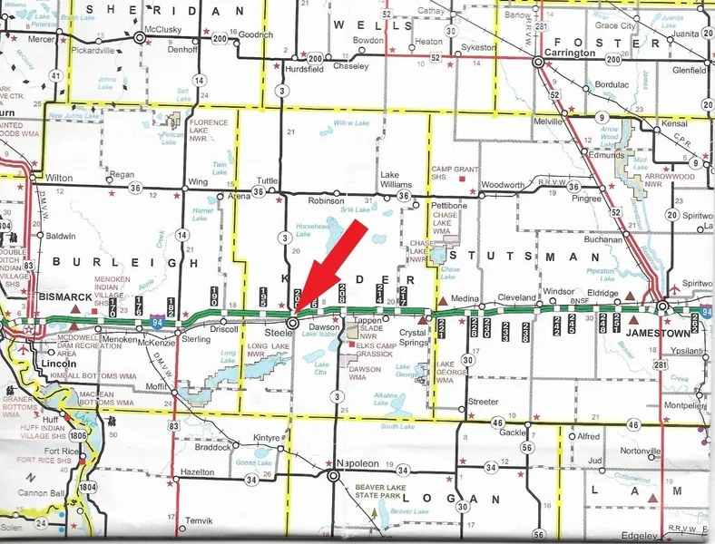 This 2.37+/- Ac Property located outside North edge of Steele, North Dakota with quick access to Interstate 94 & Hwy. 3, features a 4 Bedroom/2 Bathroom House with a Single Attached Garage, a Quonset, Chicken Coop, and 2 small Grain Bins. The Home has 2 Bedrooms and 1 Bathroom on the Main-Level and 2 Non-Conforming Bedrooms,1 Bathroom and Fireplace in the Lower Level. Propane Forced Air Heat and Central A/C, updates include Shingles, Vinyl Siding, New Flooring throughout the Main-Level and some in Basement. Seller's Asking $445,000 which now includes extra Land and Quonset..