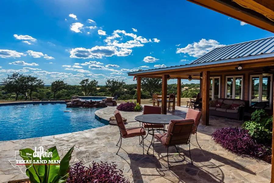 The 2,700 sq ft main home features four bedrooms and three and one half bathrooms The Hill-Country Style home is tastefully appointed with stone fireplace, vaulted ceilings, lots of window, stainless kitchen appliances, and a large vaulted great room overlooking the pool area. The home is designed around a gorgeous pool and spa. The pool is approximately 35,000 gallons with a large attached spa. The pool and spa have a Pebble Tech surface and the circulation and filtration equipment are top of the line. The pool and spa are joined to the home by flagstone patio, much of which is shaded by the homes porches. The pool, patio, porches, and much of the main home are positioned to take in the dramatic views of the surrounding landscape.
