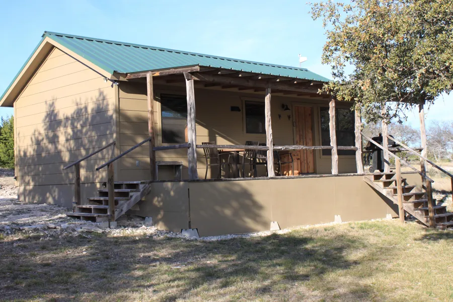 50 acres with a cabin inside a high fenced game ranch. Ranch is loaded with exotics and high genetic whitetail. Axis, fallow, red stag, blackbuck, aoudad, hogs, turkeys, and even good dove hunting. The cabin is off grid with a completely self sufficient solar system and 500 gallon propane tank. The covered porch overlooks the pond and has tremendous views of the Texas Hill Country. The water well is also on a solar system. The water well is plumbed to a sizable stock pond. The ranch has a paved easement fronting the property for good access. Also, there is a private entry gate for good security and its an automatic remote control entry system. The ranch is game managed by a wildlife biologist to ensure the quality of the whitetail and exotics. The property is on a wildlife tax exemption for lower taxes. Seller is conveying a large portable barn and most of the household furnish...