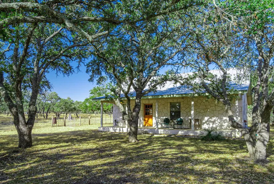 The property features a charming, 869 SF, 2 bedroom, 1 bath ranch-style home built in 2000. The exterior is constructed of attractive Austin stone and it has a metal roof. There is a 90 SF porch on the back of the home and a 275 SF porch on the front, that overlooks the property. The living room and kitchen are arranged in an open floor plan, with a fireplace complementing the living room. There is also a 1-car detached garage connected to the house via a short sidewalk that could also serve as workshop. Clean and well maintained, this delightful home could be a full-time residence or weekend house.