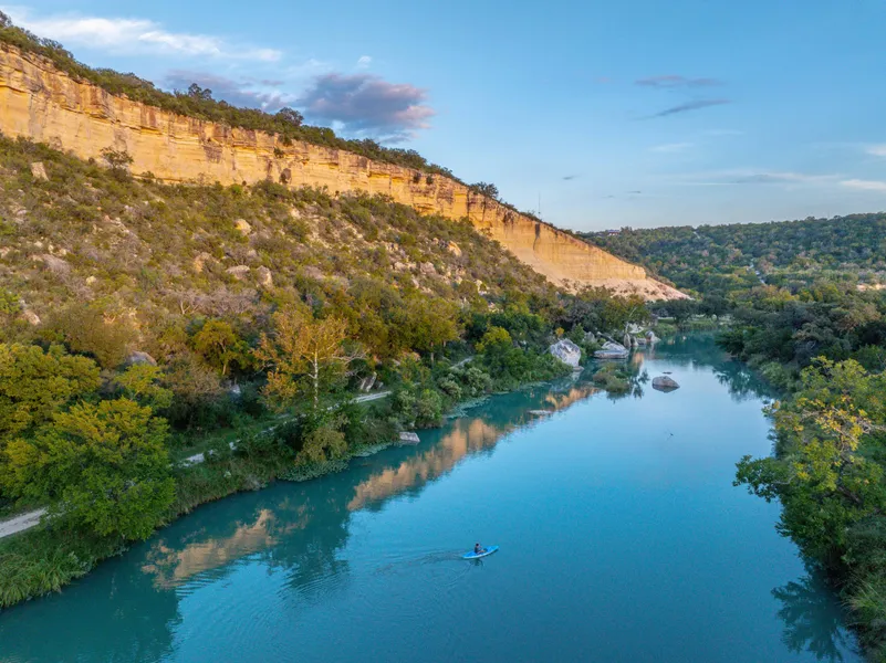 The terrain climbs quickly away from the creek, breaking into canyons, ridges, and rolling uplands that connect into the Blue Mountains. From the higher elevations, long views stretch for miles across the Hill Country, capturing both sunrise and sunset. The land possesses great native habitat for thriving wildlife, with whitetail, axis, and turkey calling the ranch home.