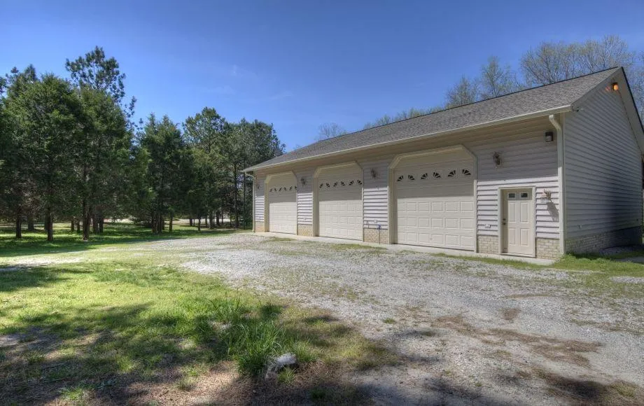 Detached 2,400' +/- 3 bay brick/vinyl shop w/14' ceiling, 6" concrete floor, 12'x12' doors, full bathroom, heated/cooled by central AC & propane furnace, 16'x60' covered equipment storage w/gravel floor, 200 amp electrical service w/generator panel, and 500 gallon propane tank (automotive lifts do not convey)