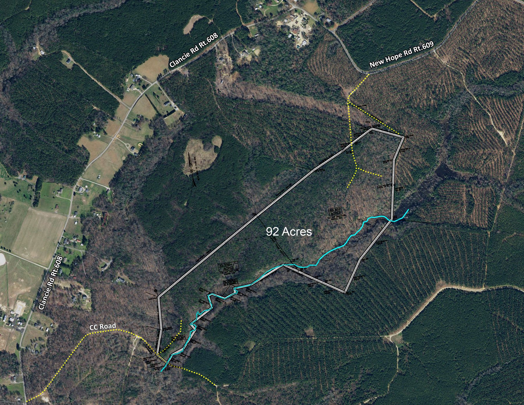 92.007 acres off Clancie Rd and New Hope Rd in Shacklefords off Rt.33 near West Point. King and Queen County tax map 1623-135R parcels 1110 and 1111. Nice stream through property plus trails throughout. Property is accessed by 2 entrances. Entrance #1 is on the CC road off Clancie Rd. Entrance #2 is a prescriptive easement off New Hope Rd and is the better way to view the property. Nicely wooded with 742,079 board feet of timber (International Log Rule). Timber cruise available from 2016 estimated the timber value at $126,108. Property is tax assessed at $125,200. Ideal for timber, hunting, recreation, or residential.